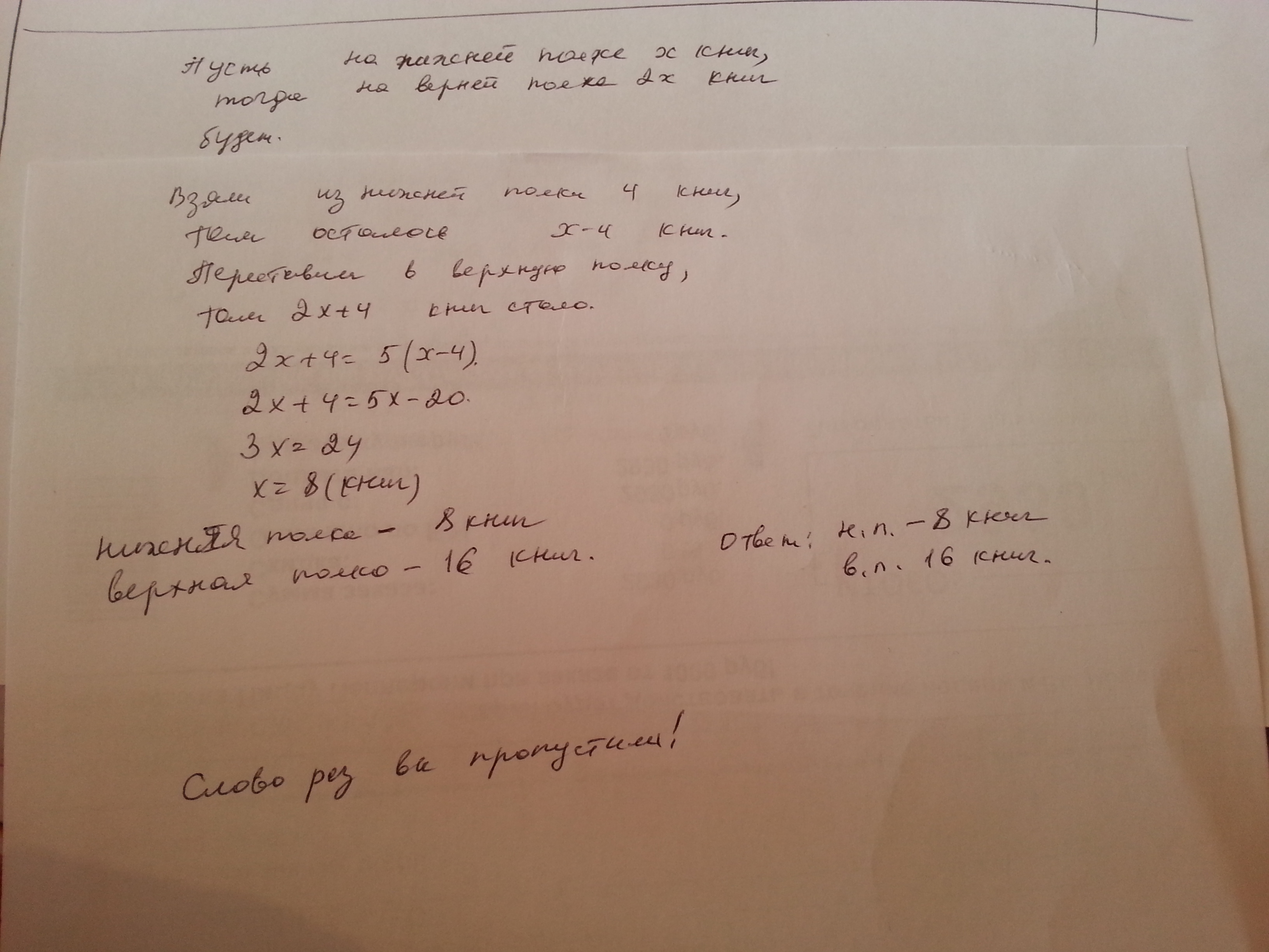 На двоих полках стояли книги. На верхней в 2 раза больше чем на нижней. После того как с нижней полки на верхнюю переставили 4 книги на верхней полке стало в 5 книг больше. Сколько книг стояло на каждой полке изначально?