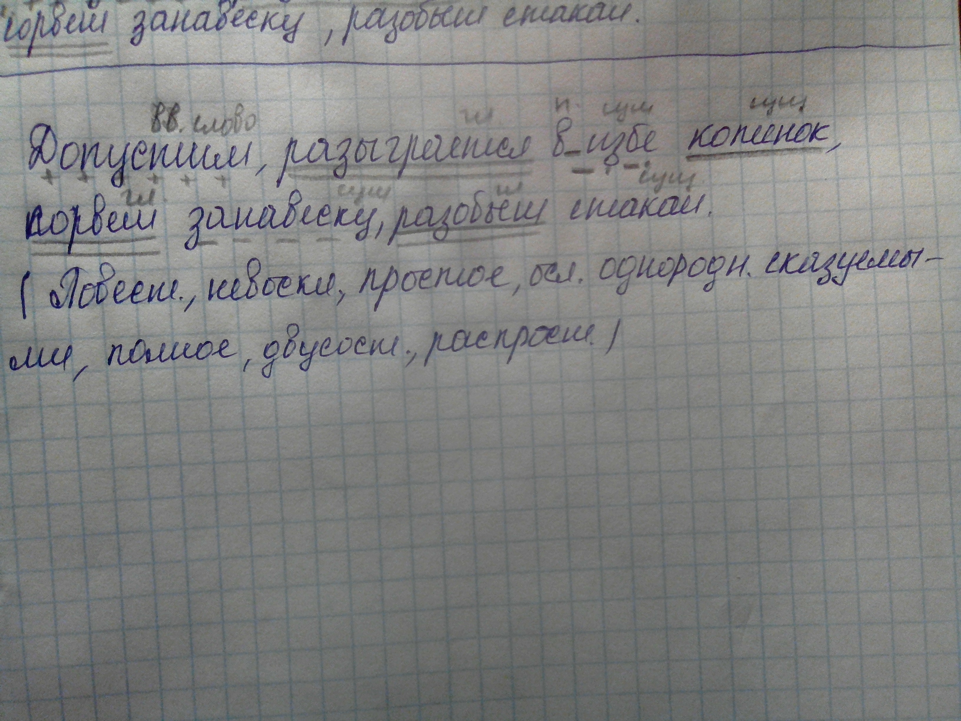 Помогите пожалуйста. Допустим, разыграется в избе котенок, сорвет занавеску, разобьет стакан. разобрать предложение (гл; суш; сказ; прилог). дать хар-ку предложения (например:распрос восклиц вопрос и т.д)
