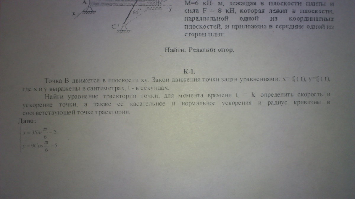 Найти уравнение траектории точки; для момента времени t, = 1с определить скорость и ускорение точки, а также ее касательное и нормальное ускорения и радиус кривизны в соответствующей точке траектории.
