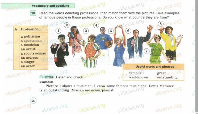 1 Menshikov is a great actor 2 my granny is a talented actress 3 people don't believe politicians 4 Kharlamov is an outstanding sportman in Russia 5 my favorite singer is Alizee 6 the artist painted wonderful pictures 7 my favorite musician is Ennio Morricone
