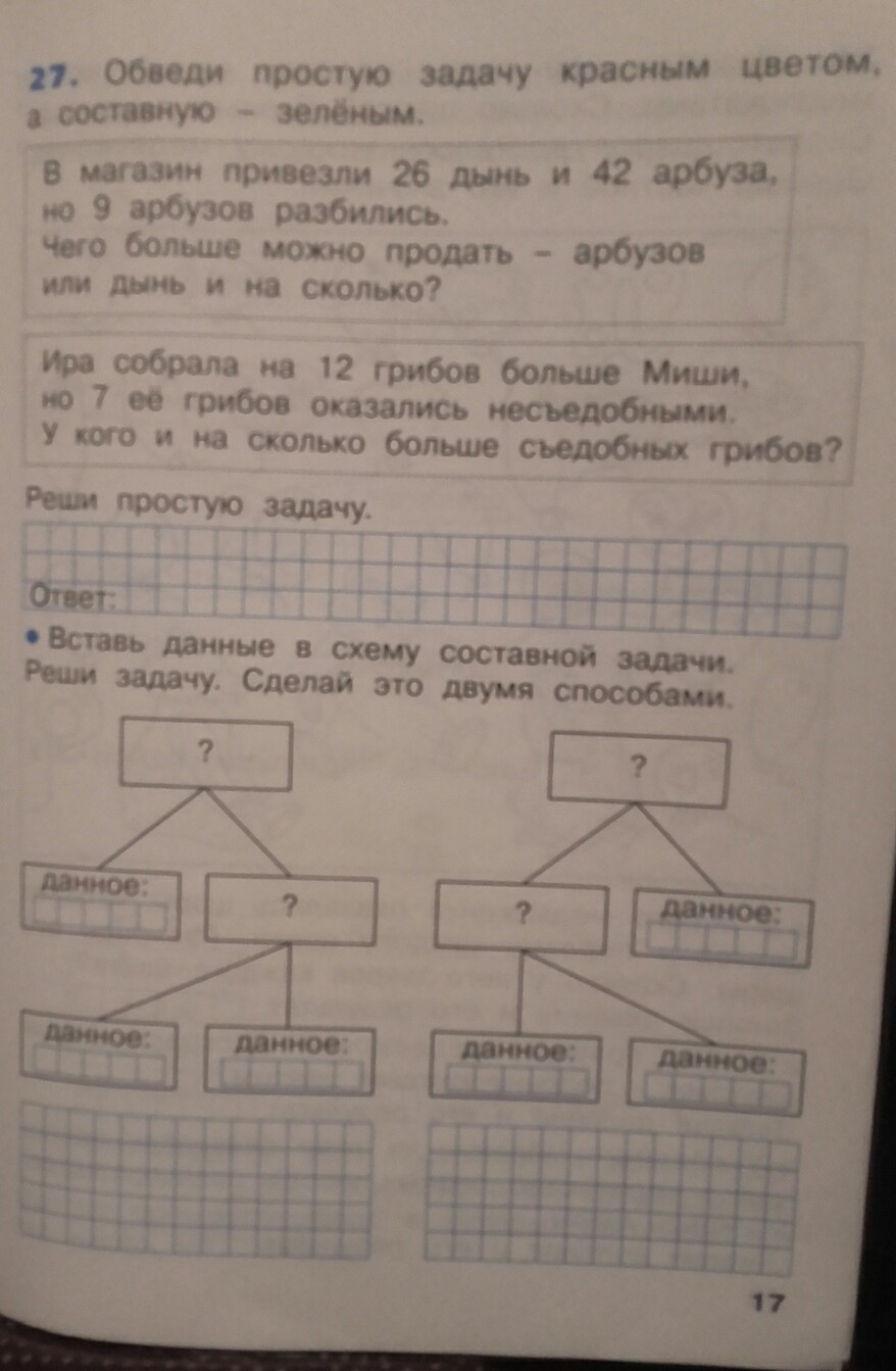 тогда... НАВЕРНОЕ надо 33+26= 59 (это в самую верхнюю) первое данное сверху видишь? туда впиши количество дынь, дальше видишь 2 знак вопроса? Туда впиши количество арбузов/ в одном данном 9 а в другом 42 (данное которое внизу)