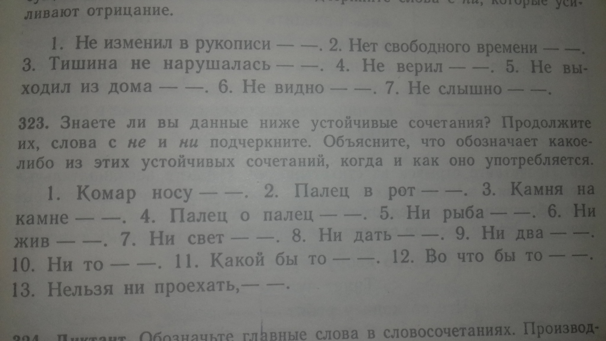 Комар носу не подточит, палец в рот не клади, камня на камне не оставит, палец о палец не ударит, ни рыба, ни мясо, ни жив ни мертв, ни свет ни заря, ни дать ни взять, ни два ни полтора, ни то ни сё, какой бы то ни был, во что бы то ни стало, нельзя ни проехать, ни пройти.