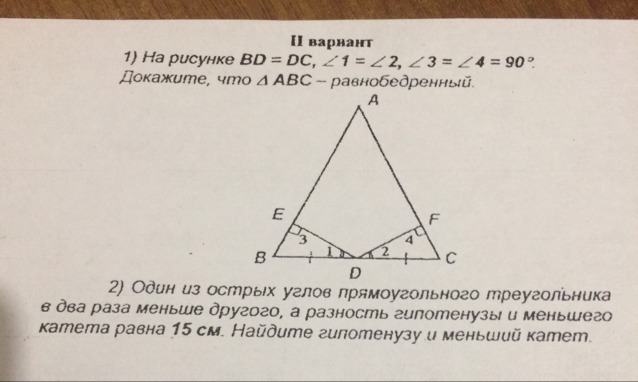 1.Если гипотенуза и острый угол одного треугольника соответственно равны гипотенузе и острому углу другого треугольника, то такие прямоугольные треугольники равны., то есть треугольник ВЕD= треугольнику DEC из чего следует , что угол В = углу С , то есть треугольник ВАС равнобедренный по двум равным углам при основании