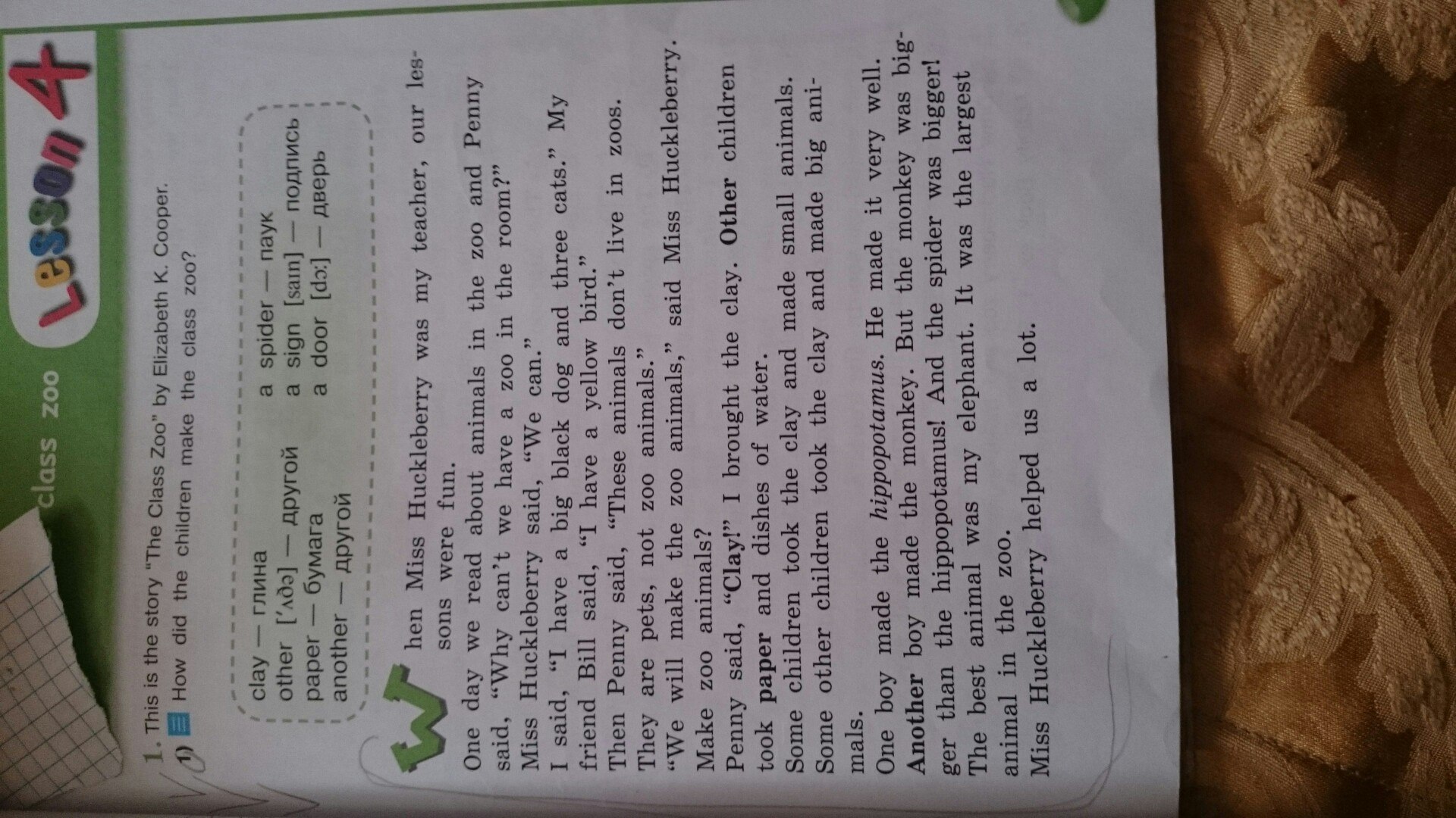 Курица мисс Гекльберри была моим учителем, нашим сыновьям было весело. Однажды мы прочитали о животных в зоопарке, и Пенни сказала: «Почему у нас не может быть зоопарка в комнате?» Мисс Гекльберри сказала: «Мы можем сказать:« У меня есть большая чернокожая и три кошки ». Мой друг Билл сказал:« У меня есть желтая птица ». Затем Пенни сказала:« Эти животные не живут в зоопарках. Они домашние животные, а не животные. Зоопарк животных ". Мы сделаем животных зоопарка", сказала мисс Гекльберри. Сделать животных зоопарка? Пенни сказала: «Клей!» Я принес глину. Другие дети брали бумагу и посуду с водой. Некоторые дети брали глина и делали мелких животных. Некоторые другие дети взяли глину и сделали больших животных. очень хорошо. Один мальчик сделал бегемота. Он сделал это. Другой мальчик сделал обезьяну. Но обезьяна была больше, чем бегемот! И паук был biggert. Лучшим животным был мой эльф, это было самое большое животное в зоопарке. Мисс y нам очень помогла.