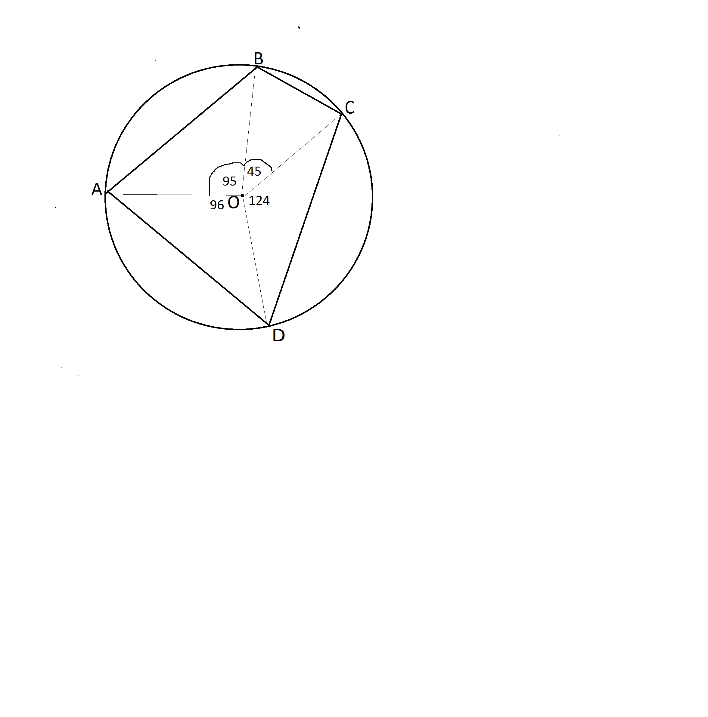Стороны четырехугольника авсд ав вс сд и ад стягивают дуги описанной окружности градусные величины которых равны соответственно 95гр.,45гр.,124гр.,96градусов. Найдите угол В этого четырехугольника.Ответ дайте в градусах.