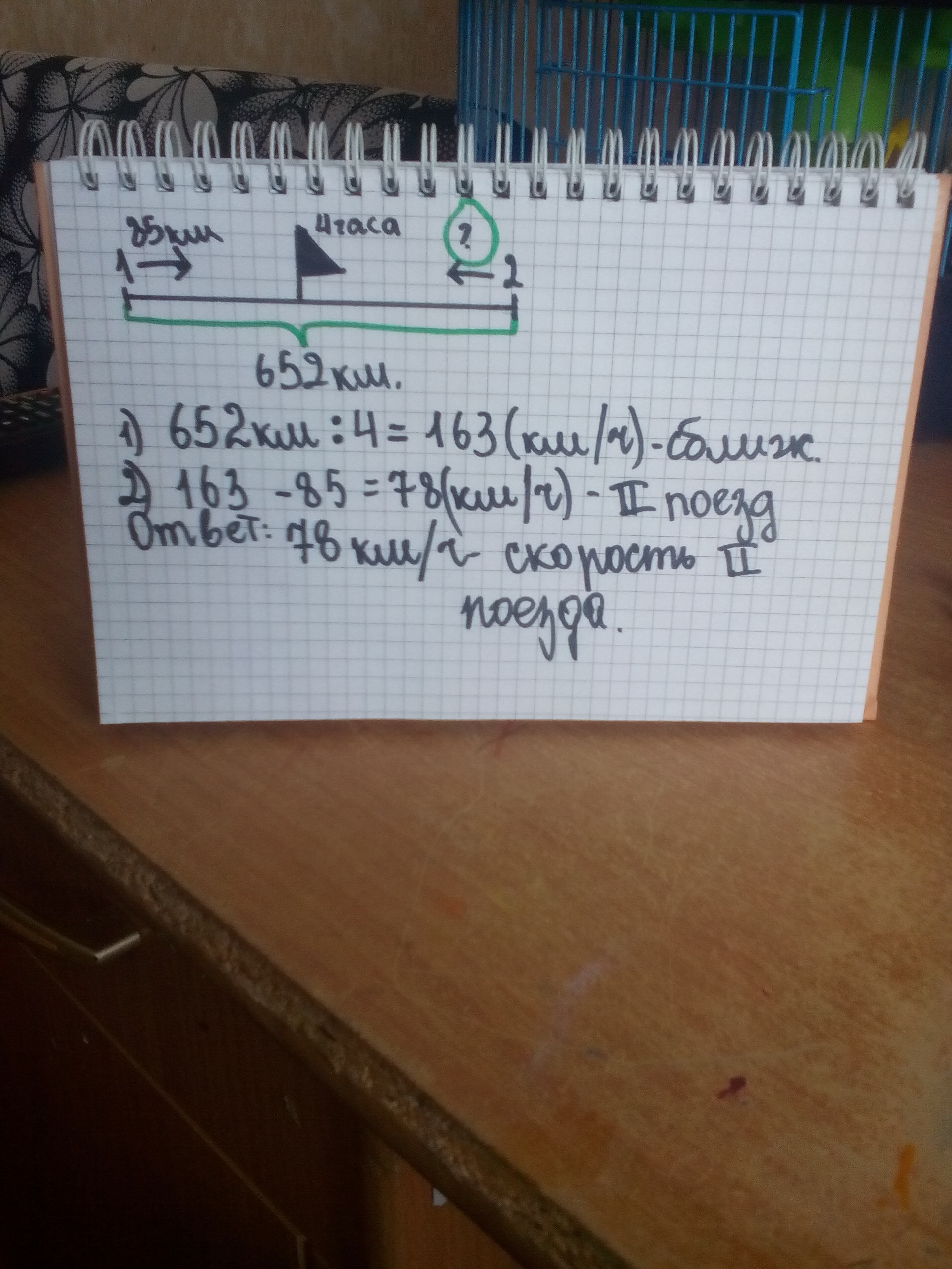 От 2 станций которые находятся на расстоянии 652 км вышли Одновременно навстречу друг другу два поезда и встретились через 4 часа Скорость одного поезда 85 км ч С какой скоростью шел другой поезд
