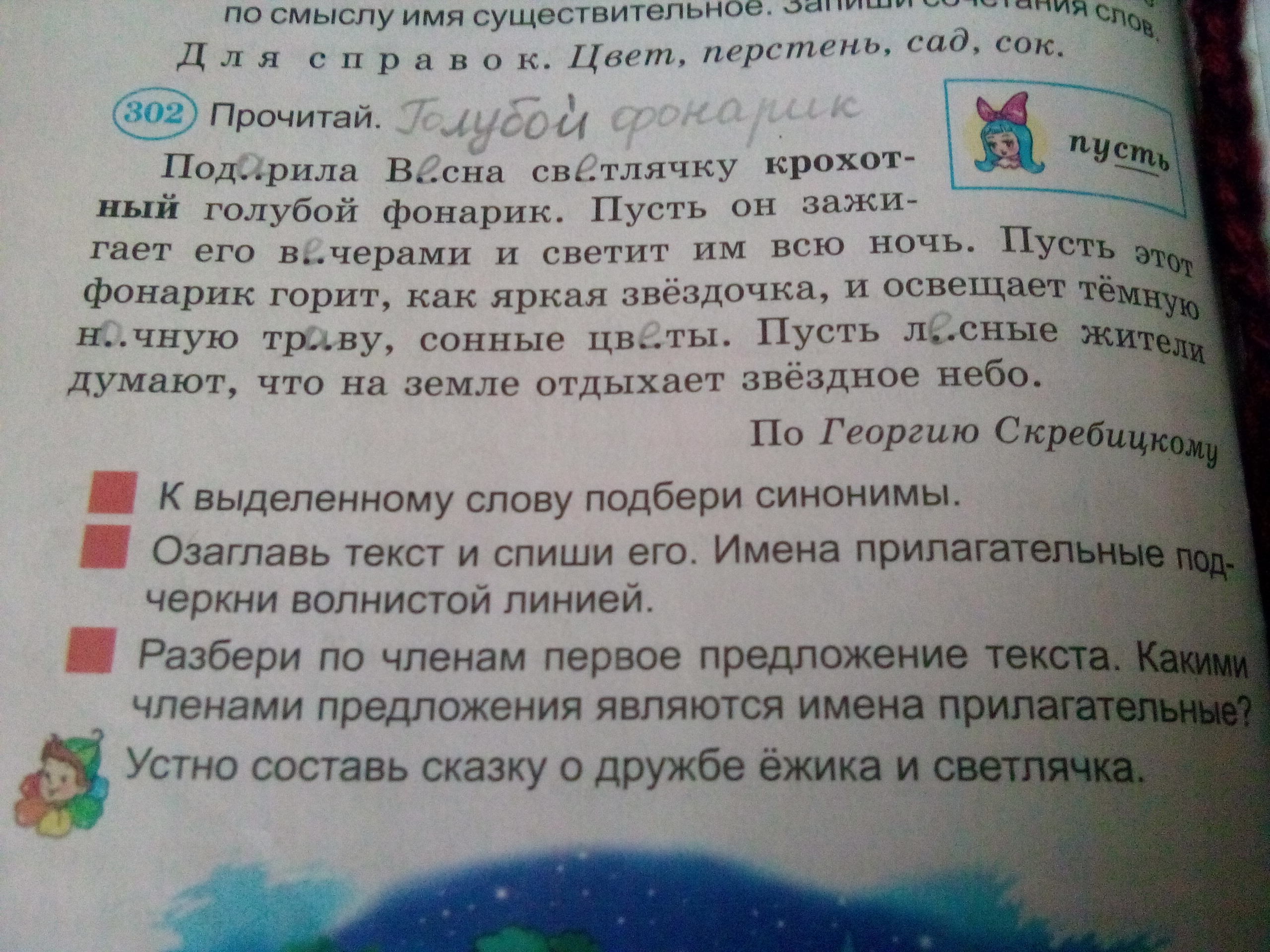 3-подарила-сказуемое,весна-подлежащее,светлячку-дополнение,крохотный и голубой-обстоятельство,фонарик-определение