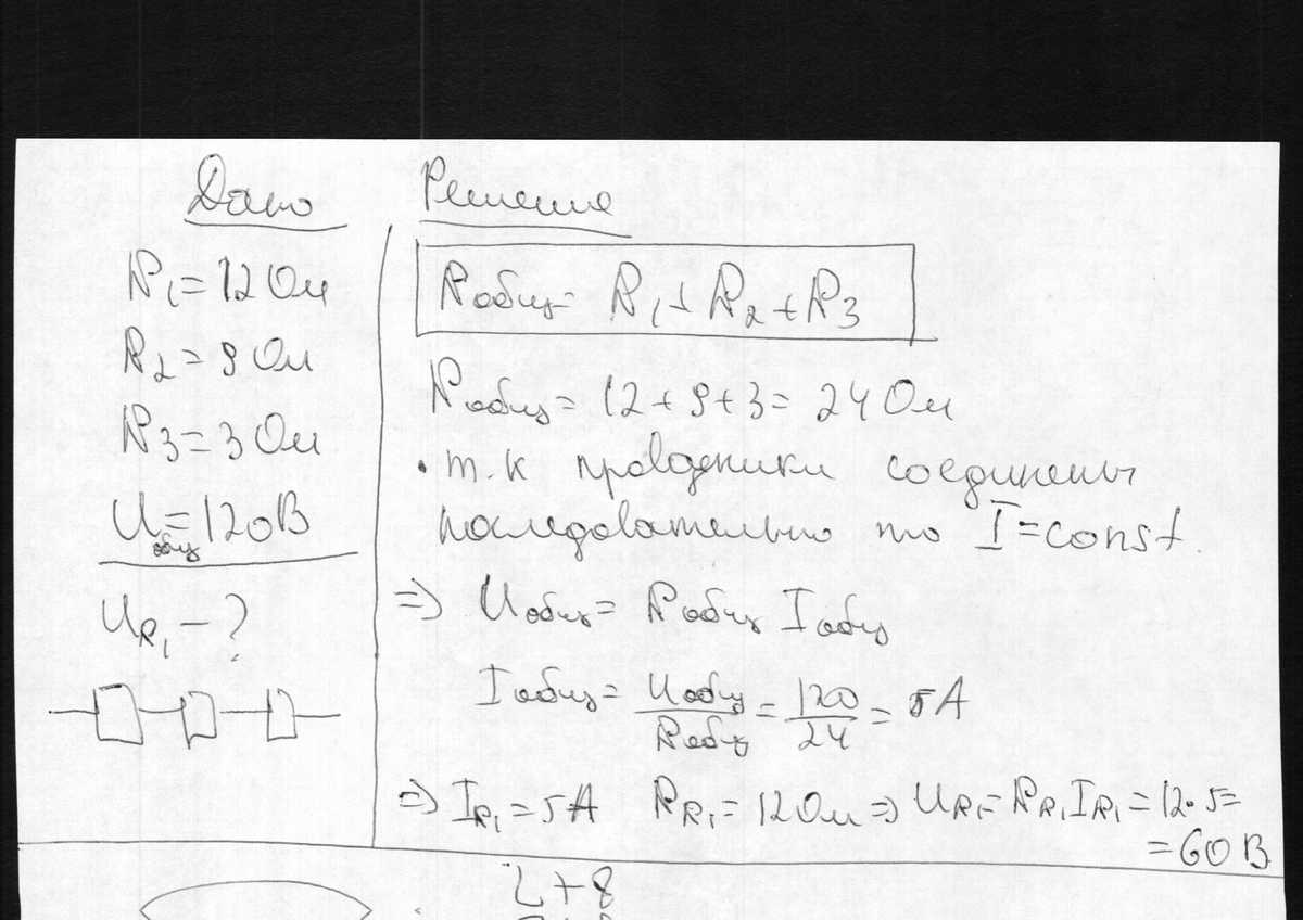 Три проводника с сопротивлениями 12 Ом, 9 Ом и 3 Ом соединены последовательно. Напряжение на концах цепи 120 В. Найти падение напряжения на проводнике с сопротивлением 12 Ом