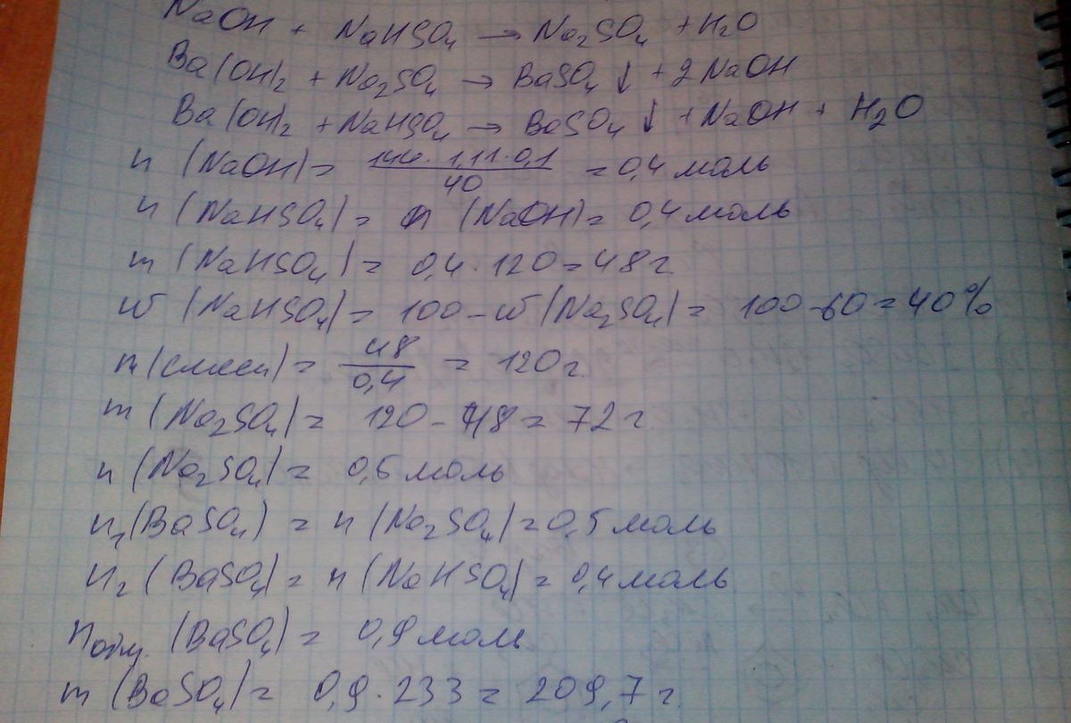 Смесь гидросульфита и сульфата натрия с массовой долей сульфата в ней 60% может вступить в реакцию с 144 мл 10%-ного раствора гидроксида натрия (р=1,11 г/мл). На исходную смесь модействовали избытком раствора гидроксида бария. найдите массу осадка образовавшегося при этом.