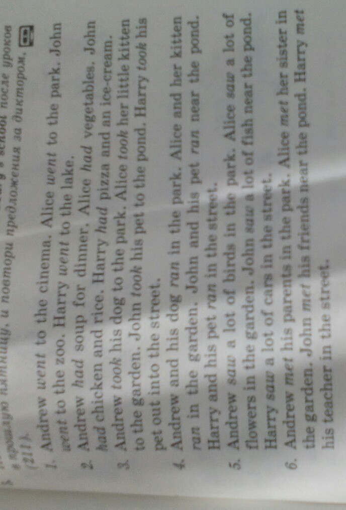2)эндрю тук хис догту зэ парк . элис тук хё литл китэн ту зэ гардэн. джон тук хис пэт ту зэ поун. гари тук хис пэт аут инто зэ стрит.