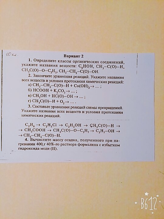 Вариант 2. 1. Тут имеется ввиду фенол или карболовая кислота-C6H5OH,видать опечатка,класс:фенолы. H3CCOH-уксусный альдегид или ацетальдегид или этаналь,класс: альдегиды. H3CCOOC2H5-этилацетат или этиловый эфир уксусной кислоты,класс:сложные эфиры. H3C-CH2COOH-пропионовая кислота,класс:одноосновные карбоновые кислоты. 4. CH2O+4Cu(OH)2=CO2+2Cu2O+5H2O, v(CH2O)=400г×0,4÷30г/моль=5,33 моль , v(Cu2O)=2v(CH2O) тогда масса Cu2O)10,66 моль×144г/моль=1535,04 г. [2,3, см. в файле]