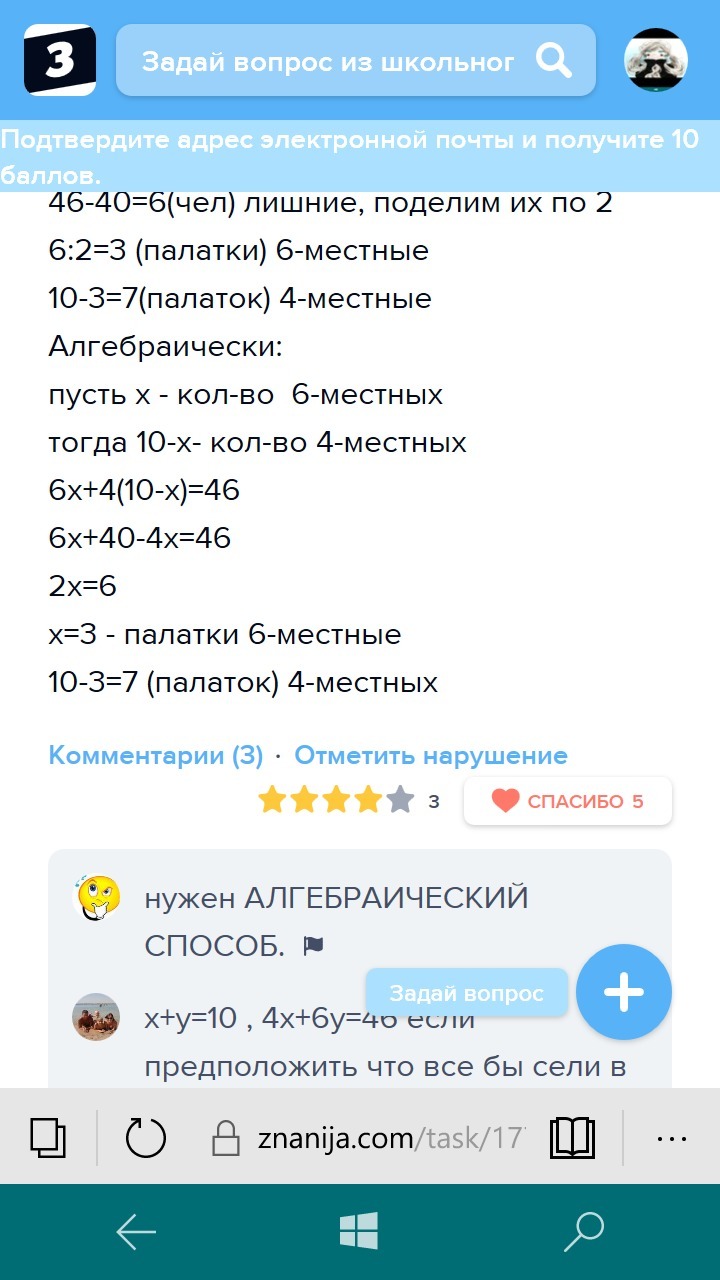 Для путешествия по реке отряда в 46 человек приготовили шестиместные и четырёхместные лодки. Сколько было тех и других лодок, если отряд разместился в десяти лодках и свободных мест в них не осталось? ( решить задачу уравнением)