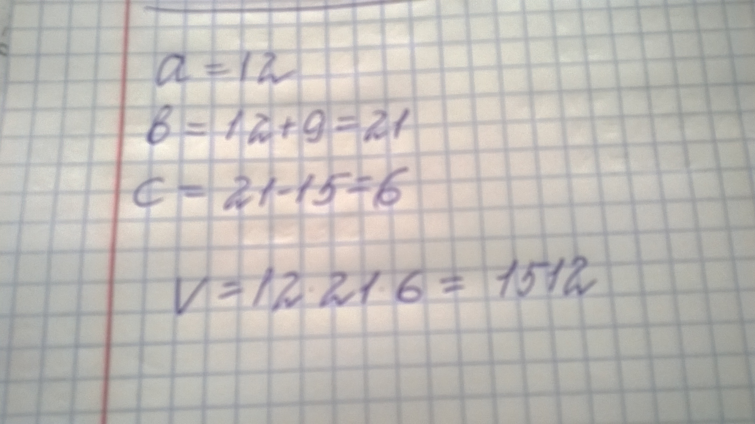 Помогите решить задачу :длина параллелепипеда равна 12 метров, высота на 9 метров больше ,а ширина на 15 метров меньше высоты.Найдите объем параллелепипеда