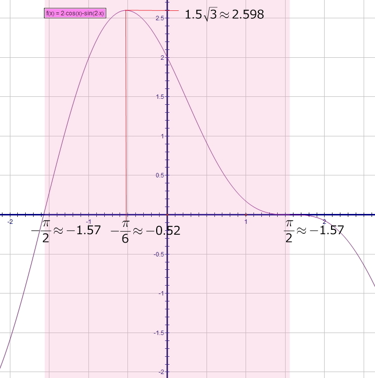 у(-π/6) = 2cos(-π/6) - sin(-2π/6) = 2cos(π/6) + sin(π/3) = √3+√3/2 = 1.5√3 <--- y_max