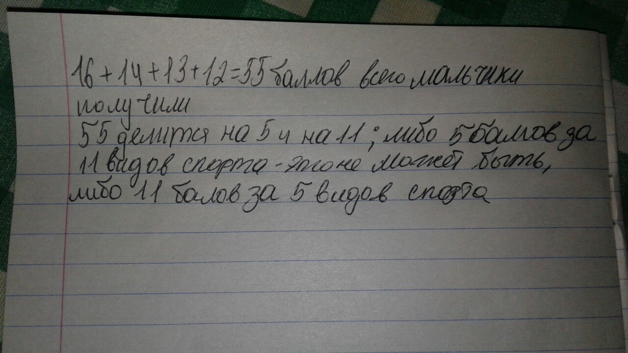 четыре мальчика соревновались в нескольких(более одного) видах спорта.в каждом из видов спорта за одно и то же место начислялось одинаковое количество баллов (выраженные натуральным числом),причем каждое из мест (1-е,2-е,3-е,4-е) мог занять только один из участников.в конце соревнований выяснилось,что мальчики получили 16,14,13 и 12 баллов соответственно.выясните,в скольких видах спорта они соревновались