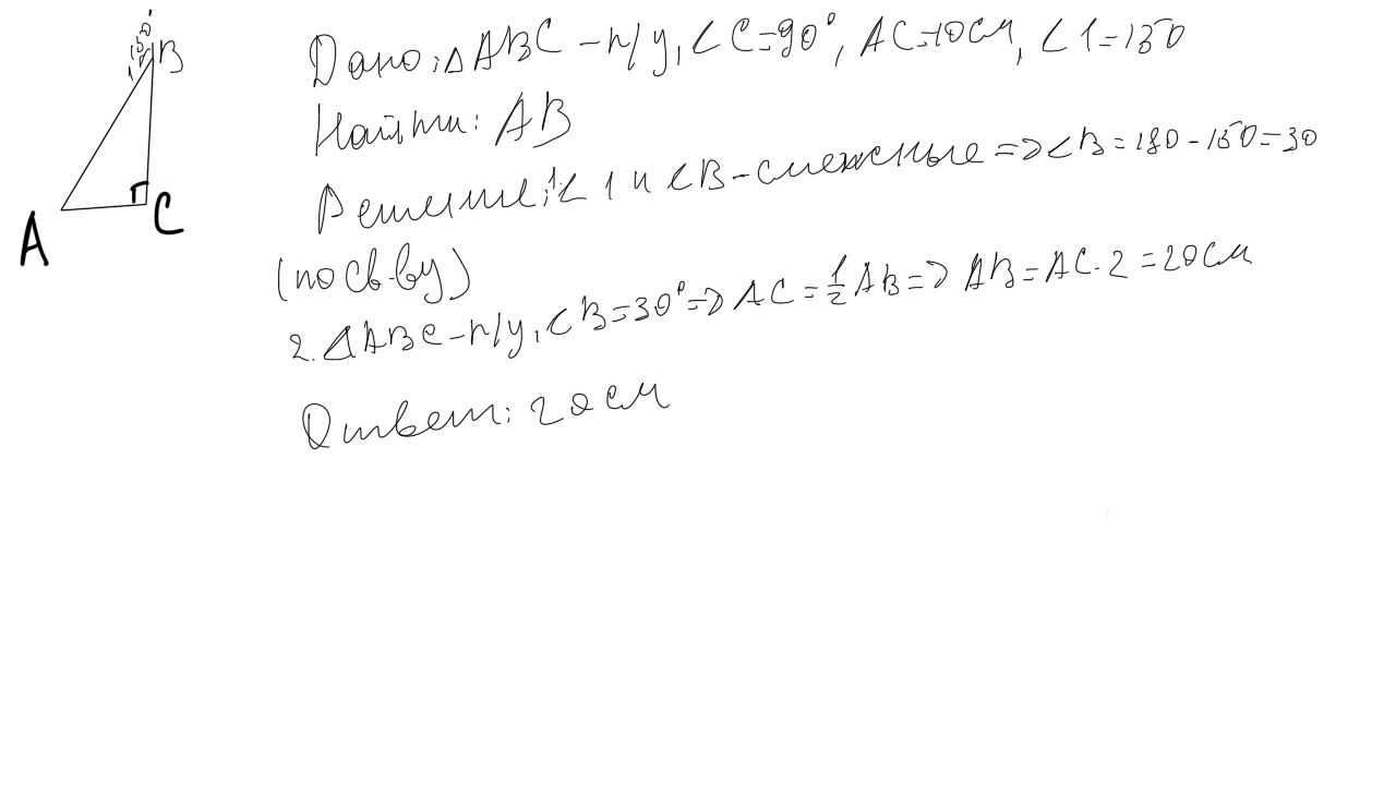 Дан треугольник abc,где угол c=90 градусов.внешний угол при вершине b=150 градусов, сторона ac=10 см. чему равна длина гипотенузы?