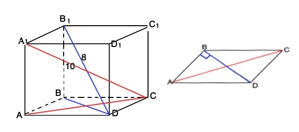 Пусть основание - параллелограмм АВСD, диагонали параллелепипеда В1Д=8, А1С=10.