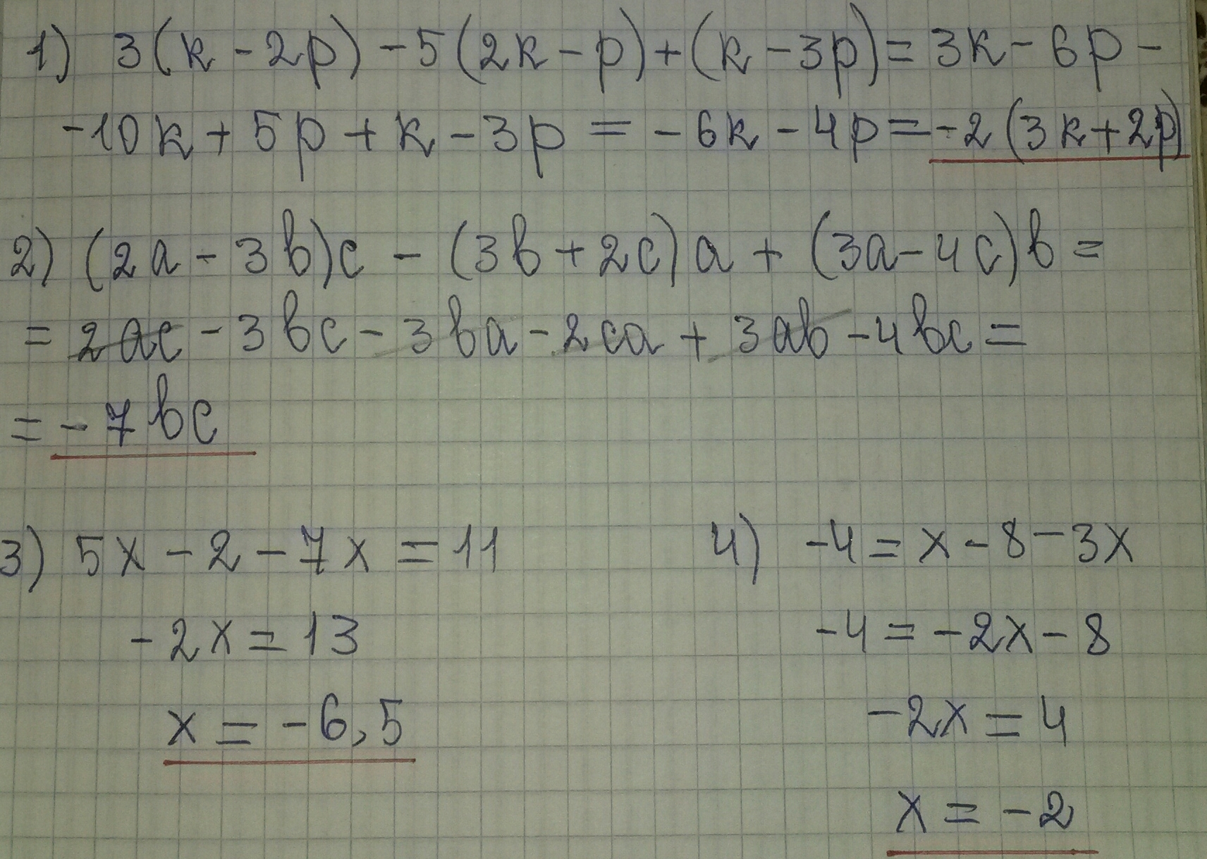 (2a-3b)c-(3b+2c)a+(3a-4c)b 5x-2-7x=11 -4=x-8-3x