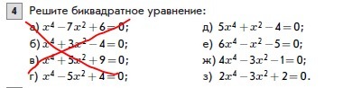 1); ; 5x^4+x^2-4=0; ,; quad t=x^2 geq 0\\5t^2+t-4=0\\D=81; ,; ; t_1= frac{-1-9}{10} =-1 textless  0; ;; ; t_2=frac{8}{10}=frac{4}{5}\\x^2=frac{4}{5}; ; ; Rightarrow ; ; ; x_1=-frac{2}{sqrt5}; ; ili; ; x_2=frac{2}{sqrt5}\\2); ; 6x^4-x^2-5=0; ,qquad t=x^2 geq 0\\6t^2-t-5=0\\D=121; ,; ; t_1=frac{1-11}{12}=-frac{5}{6} textless  0; ,; ; t_2=1\\x^2=1; ; ; Rightarrow ; ; ; x=pm 1