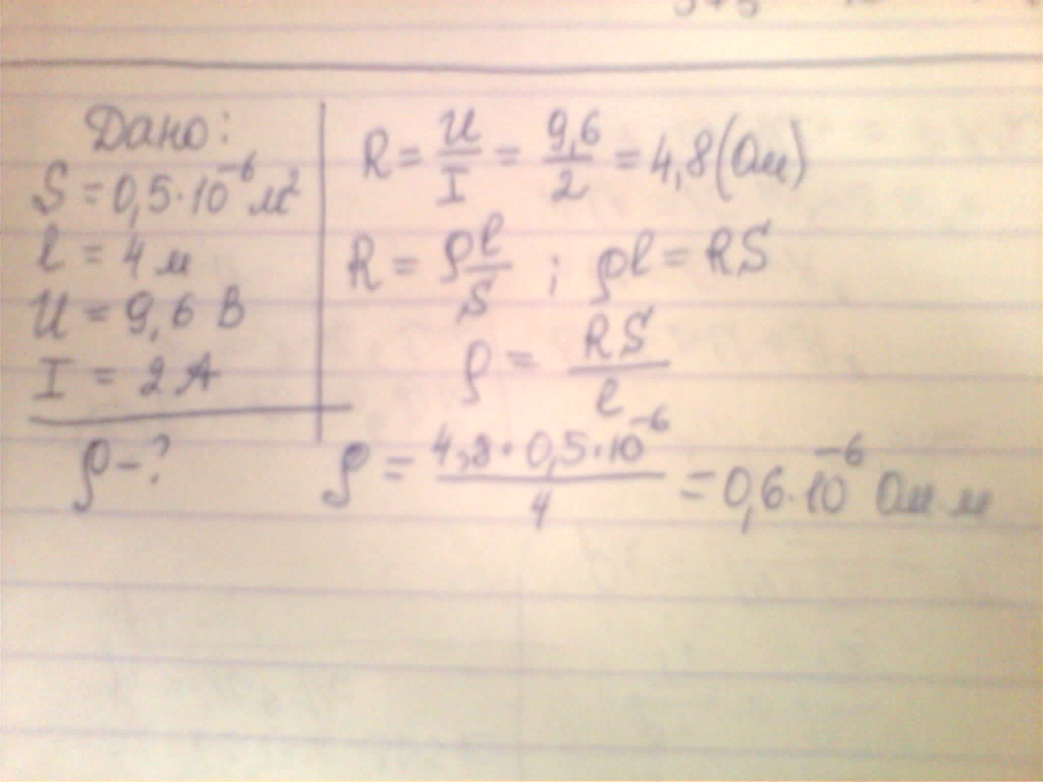 Найти удельное сопротивление сплава, из которого изготовлена проволока поперечным сечением 0,5·10-6 м2 и длиной 4 м, если напряжение на концах проволоки с равно 9,6 В, а сила тока в ней 2 А.