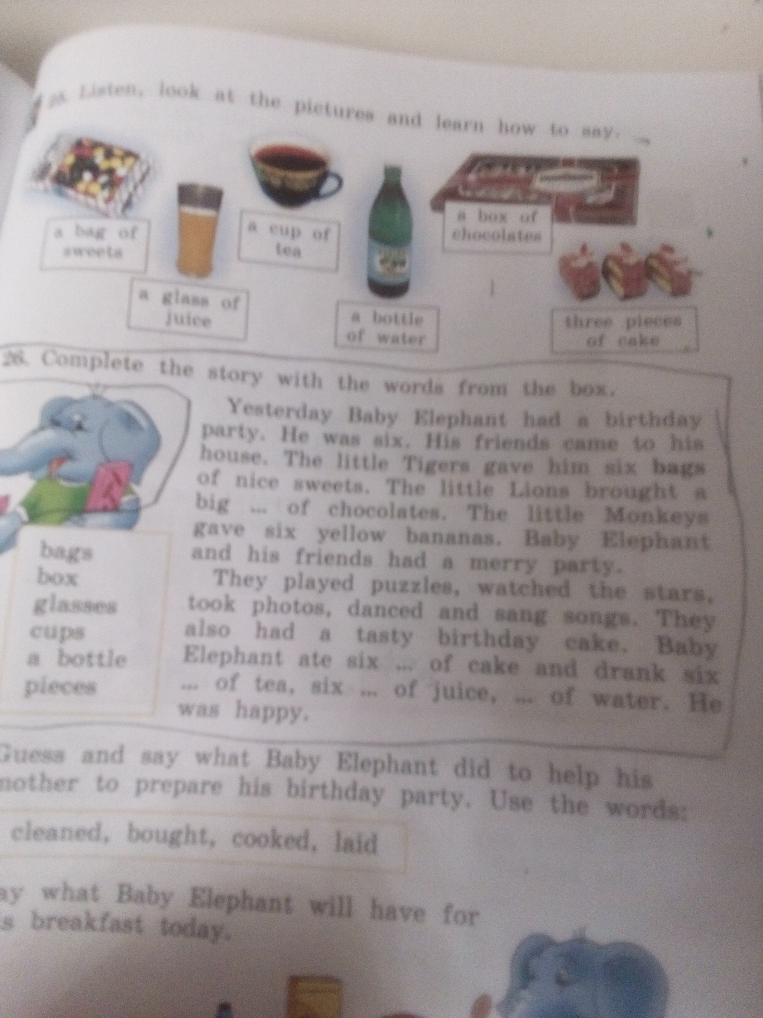 Вчера у Слонёнка был вечеринка в честь дня рождения. Ему исполнилось шесть. Его друзья пришли в его дом. Маленькие тигрята дали ему шесть мешков хороших конфет. Маленькие львята принесли большую коробку с шоколадками. Маленькие обезьянки дали шесть жёлтых бананов. Слонёнок и его друзья провели весёлую вечеринку. Они играли в пазлы, смотрели на звёзды, делали фотографии, танцевали и пели песни. Они также съели вкусный торт. Слонёнок съел шесть кусочков торта, выпил шесть чашек чая, шесть стаканов сока, шесть бутылок воды. Он был счастливым.