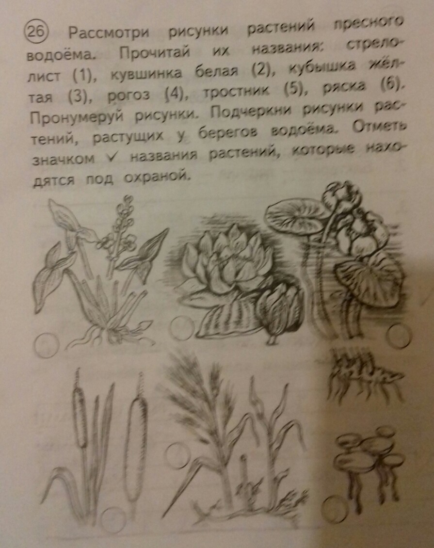 Рассмотри рисунки растений пресного водоема прочитай их названия стрелолист кувшинка белая Кубышка желтая рогоз тростник ряска пронумеруй рисунки подчеркни рисунки растений растущих у берегов водоема Отметь значком названия растений которые находятся под охраной