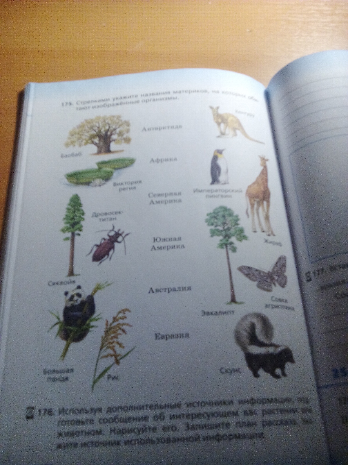 Стрелками укажите названия материков, на которых обитают изображённые организмы