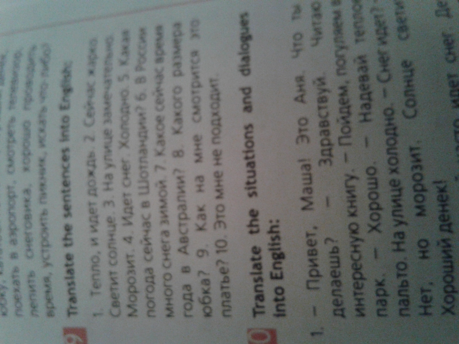 It's warm and it's raining. It is hot now. The sun is shining. The street is wonderful. Frost. Snowing. Cold. What is the weather like in Scotland? In Russia, there is a lot of snow in winter. What is the time of year in Australia? What size is the skirt? How this dress looks on me? It does not suit me.