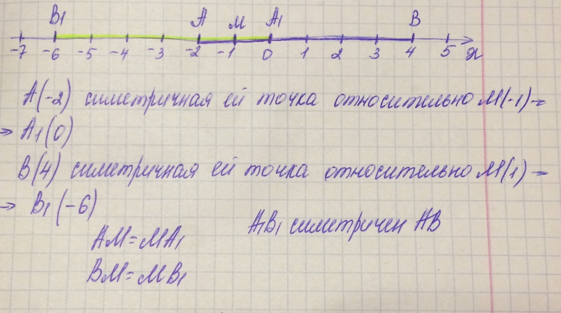На координатной прямой отметьте точки А(-2)и В(4)и постройте отрезок симметричный отрезку АВ относительно точки М(-1)