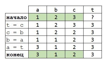 Запишите алгоритм циклического обмена значениями трех переменных a,b.c. Схема циклического обмена a->b->c Например, если до обмена было a=1,b=2,c=3, то после обмена должно стать a=3,b=1,c=2. Выполнить трассировку.