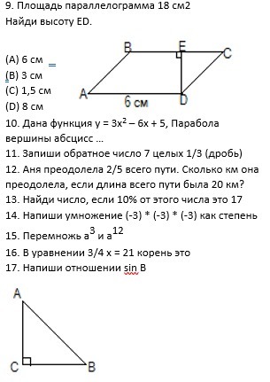 9.S=a ha=18cм² АД=ВС=а ha=DE =18:6=3cм отв.В