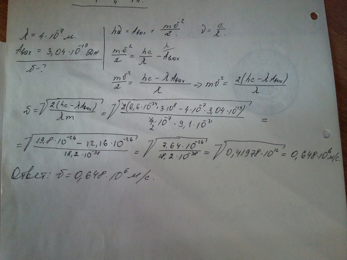 2. Найдите максимальную скоростьэлектронов, освобождаемых при фотоэффекте светом с длиной 4*10^-7 м с поверхности материала с работой выхода 3,04*10^-19 Дж.