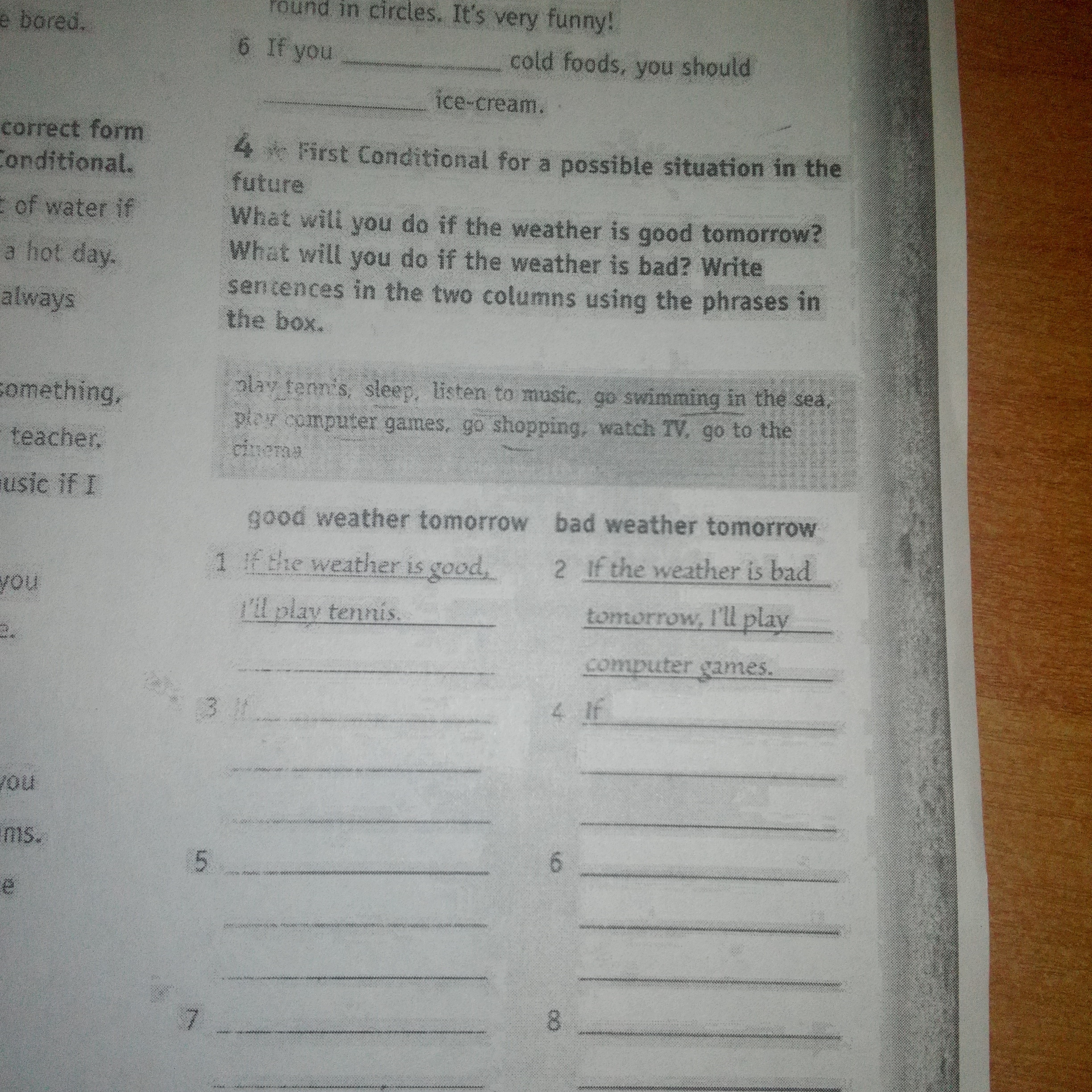 начало как в примерах,просто выбираете предложенные словосочетания во время хорошей погоды-домашние дела,а во время плохой-походы куда-либо,пользуйтесь переводчиком в конце концов