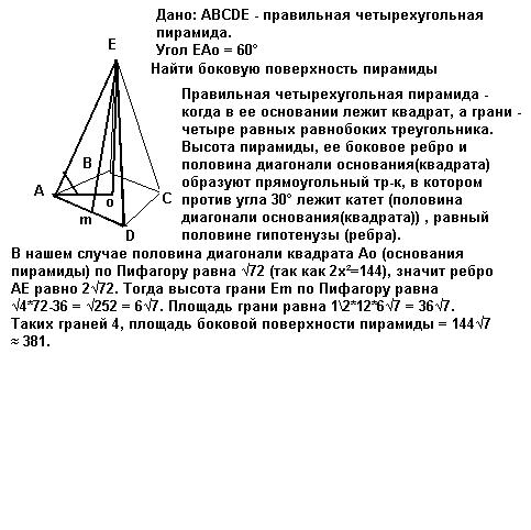 В нашем случае половина диагонали квадрата по Пифагору равна √72, значит ребро равно 2√72. Тогда высота грани по Пифагору равна √288-36 = √252= 6√7. Площадь грани равна 12*12*6√7 = 36√7. Таких граней 4, площадь боковой поверхности пирамиды = 144√7 = 381.