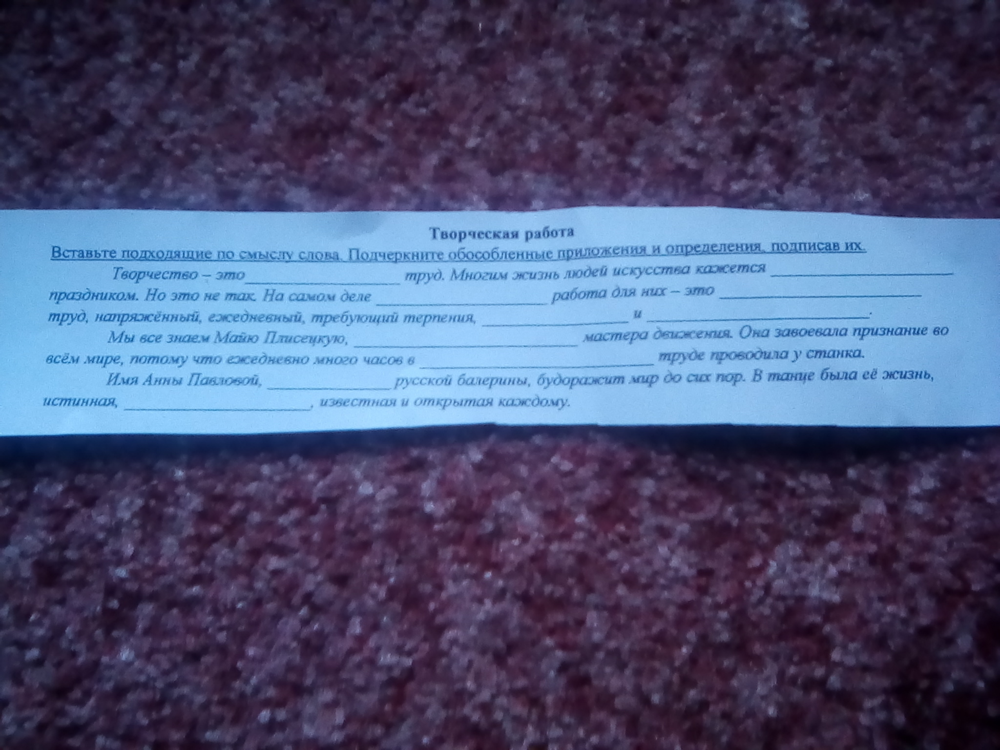 Творчество— это ТЯЖЁЛЫЙ труд. Многим жизнь людей искусства кажется СПЛОШНЫМ праздником, а на самом деле ЛЮБИМАЯ работа для них — ОГРОМНЫЙ труд, напряжённый, ежедневный, требующий терпения, ВЫДЕРЖКИ и УПОРСТВА. Мы все знаем Майю Плисецкую, УДИВИТЕЛЬНОГО мастера движения. Она завоевала признание во всём мире, проводила ежедневно много часов в ИЗНУРИТЕЛЬНОМ труде у станка. Имя Анны Павловой, ВЕЛИКОЙ русской балерины, будоражит мир до сих пор. В танце была её жизнь истинная, НАСТОЯЩАЯ, известная и открытая каждому