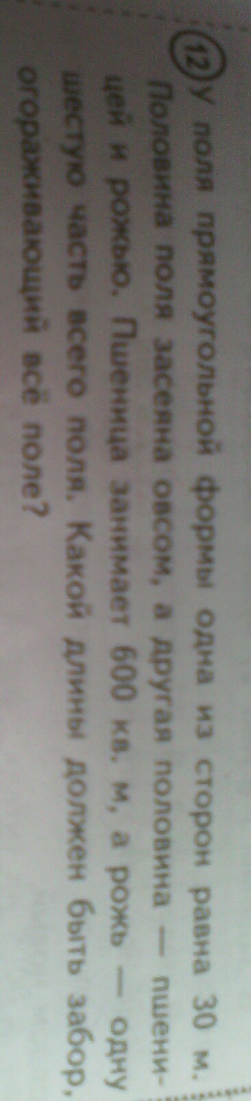 У Поля прямоугольной формы одна из сторон равна 30 метров половина поле засеяно овсом а другая половина пшеница и рожью. Пшеница занимает 600кв.м, а рожь-одну шестую часть всего поля. Какой длины должен быть забор, огораживающий всё поле?