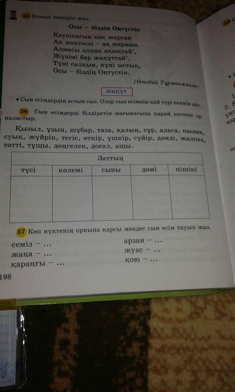 Тусі.кызыл,сұр.Көлемі:сүйір ұзын, аласа, үшкір. Сыны: шұбар, таза, суық,қызық, жүйрік. Дəмі: дəмді, тəтті тұщы,ащы. Пішіні:қалың, доғал, тегіс, жалпақ, дөңгелек.