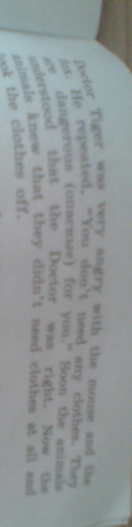 Доктор тигр был очень зол на мышку и лису. Он повторял: " Вам не нужно никакой одежды. Она опасна для вас!" И животные поняли что Доктор был прав. Теперь животные знали что им не нужны была никакая одежда и сняли с себя одежду.
