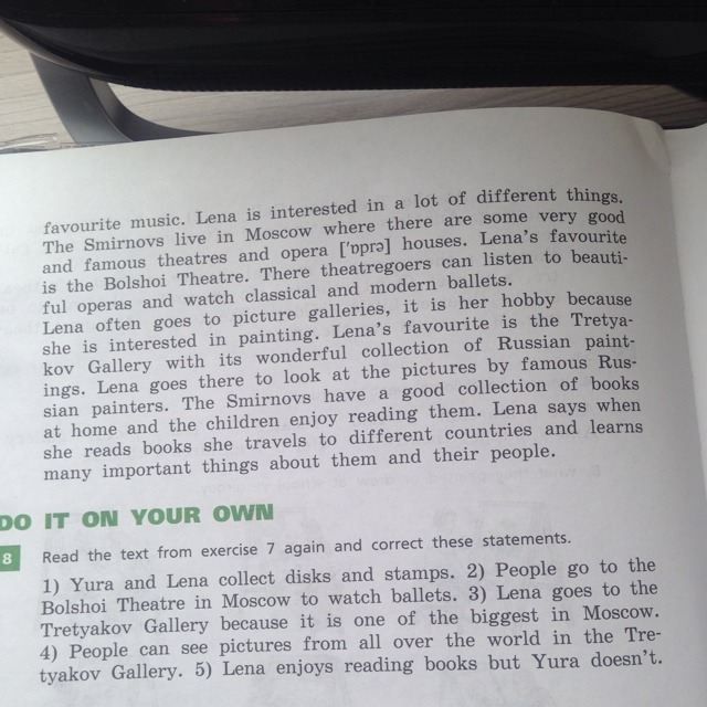 №8!!!!1)Юра и Лена собирают диски и штампы. 2) люди идут в Большой театр в Москве, чтобы посмотреть балет 3) Лена идет в Третьяковской галерее, потому что она является одним из крупнейших в Москве.4) люди могут увидеть фотографии со всего мира в Третьяковской галерее.5) Лена любит читать книги, но Юра не.