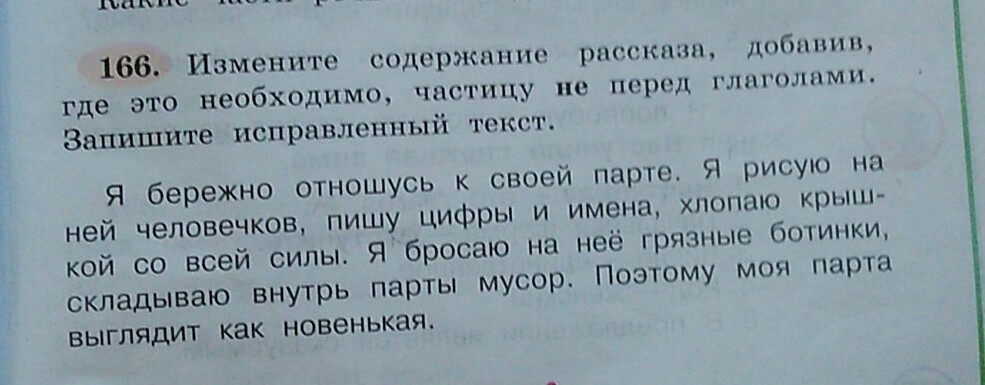 Я бережно отношусь к своей парте. Я не рисую на ней человечков, не пишу цифры и имена, не хлопаю крышкой со всей силы. Я не бросаю на неё грязные ботинки, не складываю внутрь парты мусор. Поэтому моя парта выглядит как новенькая.
