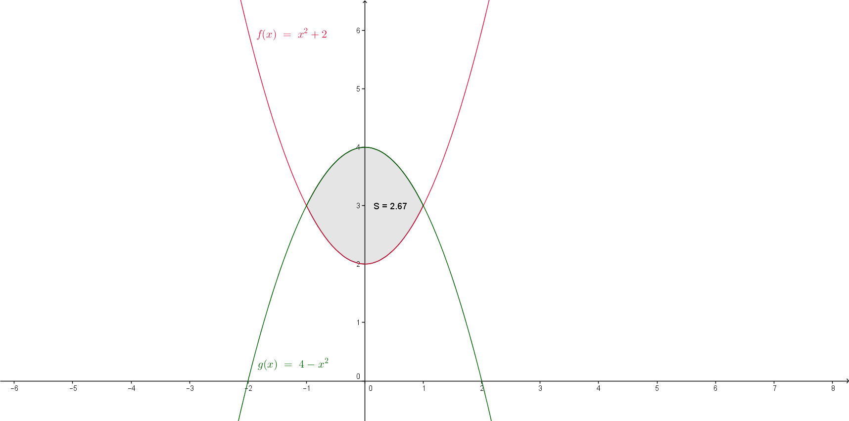 Получились параболы, которые пересекаются в точках -1 и 1 по иксу. Значит будем искать площадь фигуры на промежутке [-1;1] - пределы интегрирования