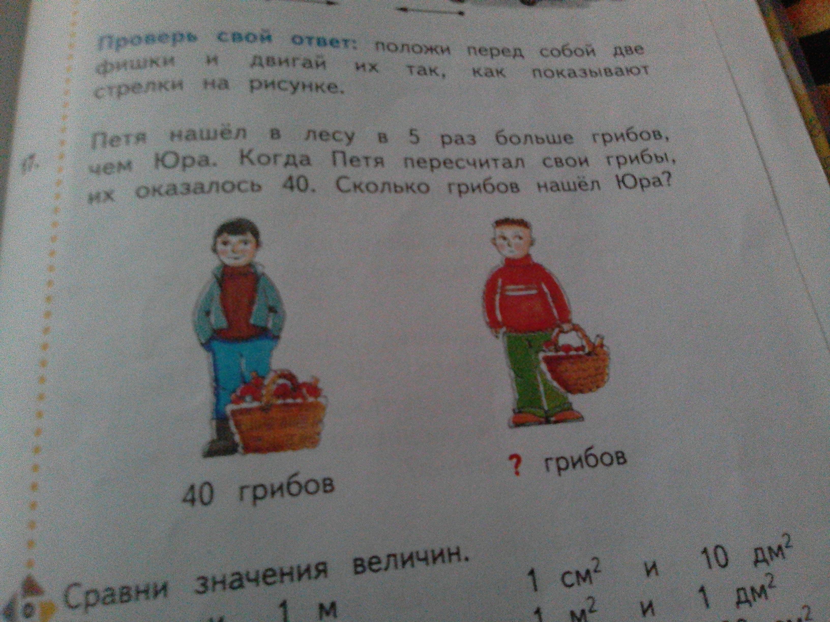 Петя нашёл в лесу в 5 раз больше грибов,чем Юра. Когда Петя пересчитал свои грибы, их оказалось 40. Сколько грибов нашёл Юра?