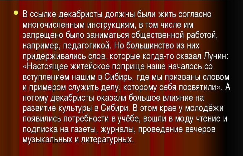 Декабристов отправляли в ссылку и в основном в Сибирь.Так всего в Сибирскую ссылку было отправлено 124 участника декабристских организаций.96 из них- в каторжную работу, остальные на бессрочное поселение. 113 из числа сосланных в Сибирь принадлежали к дворянскому сословию. Ниже можешь посмотреть на изображении сам образ их жизни. :з