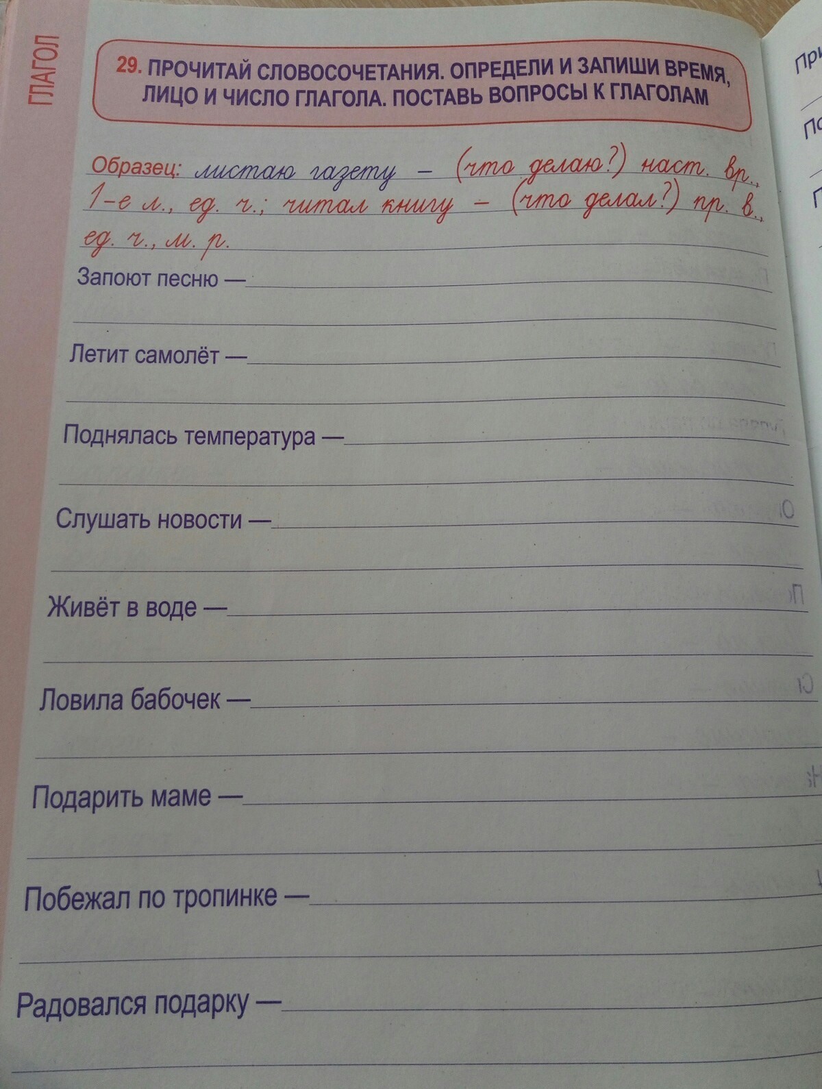 прочитайте словосочетания.определи и запиши время,лицо и число глагола.поставь вопросы к глаголом