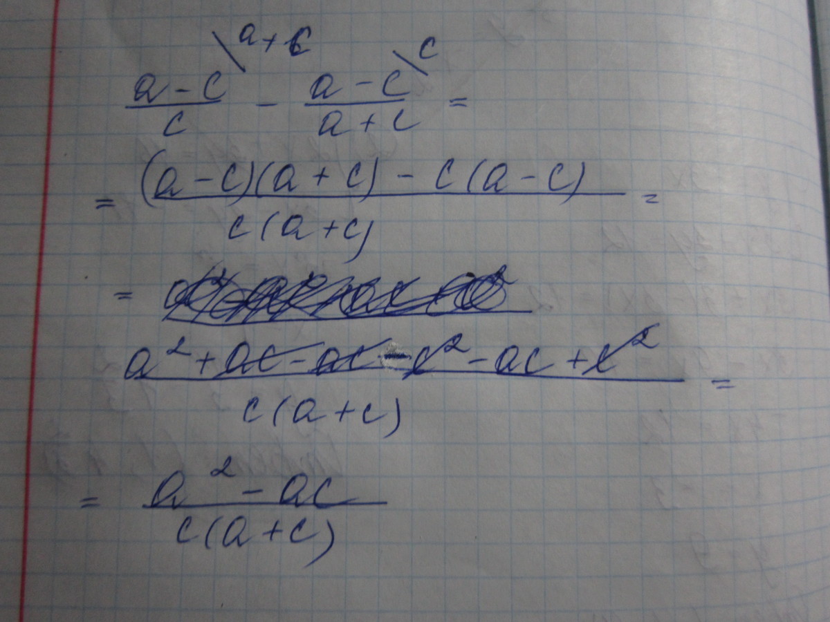 приведем к общему знаменателю с(а+с). Получим(а-с)(а+с)-с(а-с)/с(а+с)=(а^2-c^2-ac+c^2)/с(а+с)=а^2-ас/ас+с^2