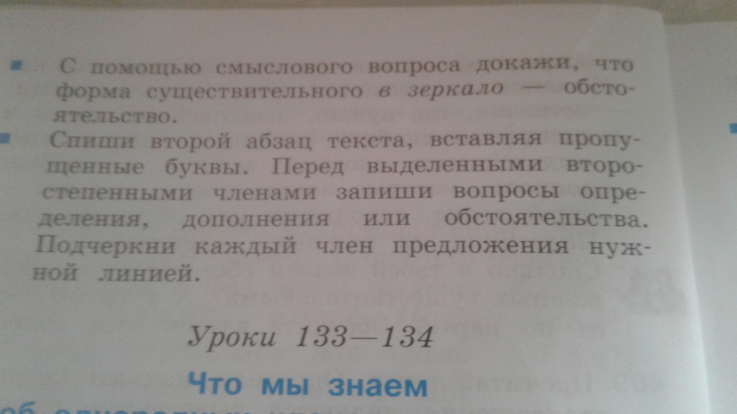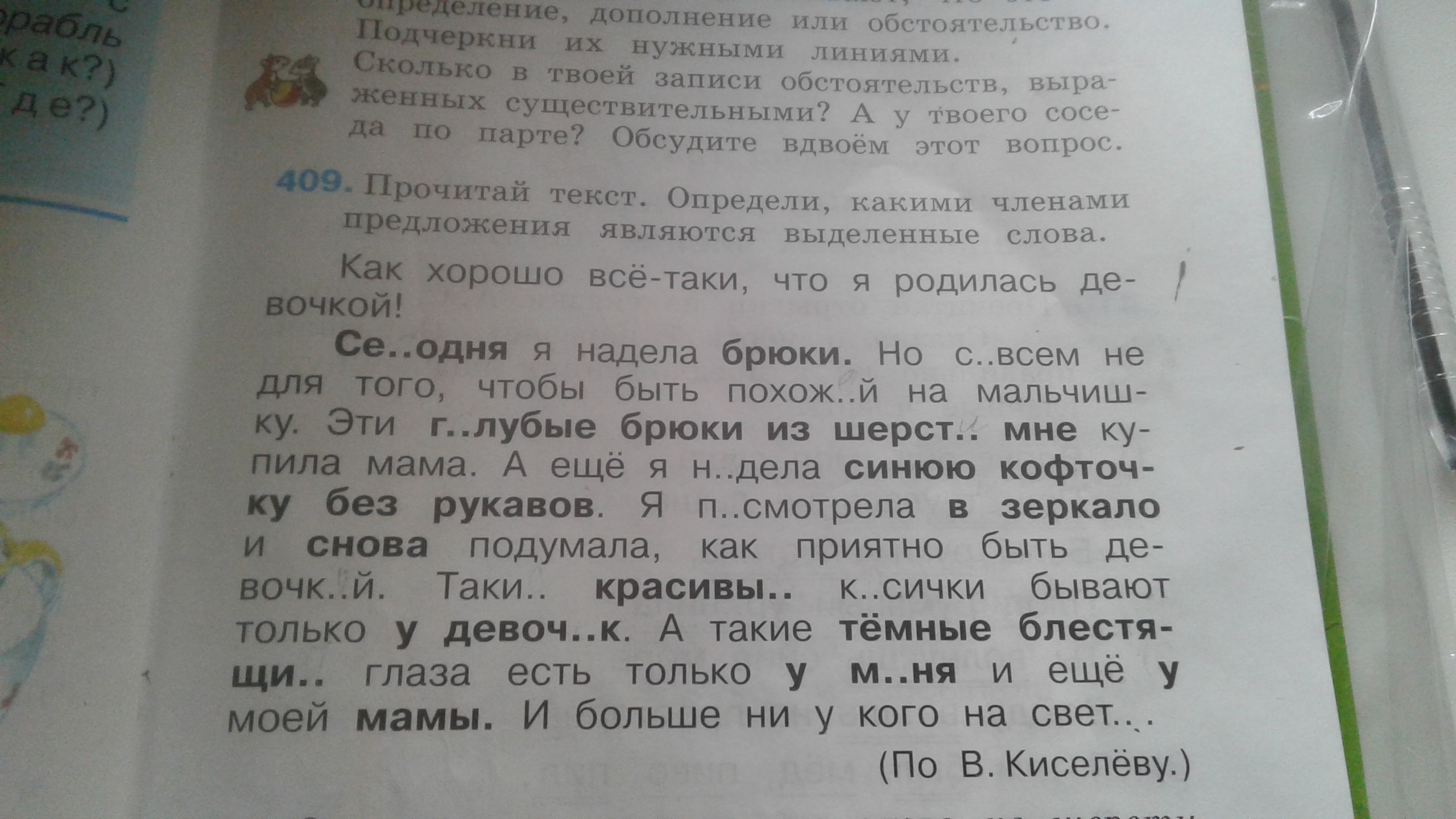 Сегодня обстоятельство времени выражено сущ подчеркивается черточкой с точкой Брюки дополнение выражено сущ подчеркивается черточкой Голубые определение выражено прил Брюки тоже самое Из шерсти дополнение выражено по моему сущ подчеркивается черточкой Мне местоимение (писать сверху) подчеркивается линией Синюю определение выражено прил (подчеркивается волнистой линией) Кофточку дополнение выражено сущ подчеркивается черточкой Без рукавов дополнение выражено сущ подчеркивается черточкой В зеркало дополнение выражено сущ с предлогом подчеркивается черточкой Снова обстоятельство образа действия выражено наречием подчеркивается черточкой с точкой Красивые определение выражено прил подчеркивается волнистой линией У девочек дополнение выражено сущ с предлогом подчеркивается черточкой Темные Блестящие определение выражено прил подчеркивается волнистой линией У меня местоимение подчеркивается линией Мамы дополнение выражено сущ подчеркивается черточкой