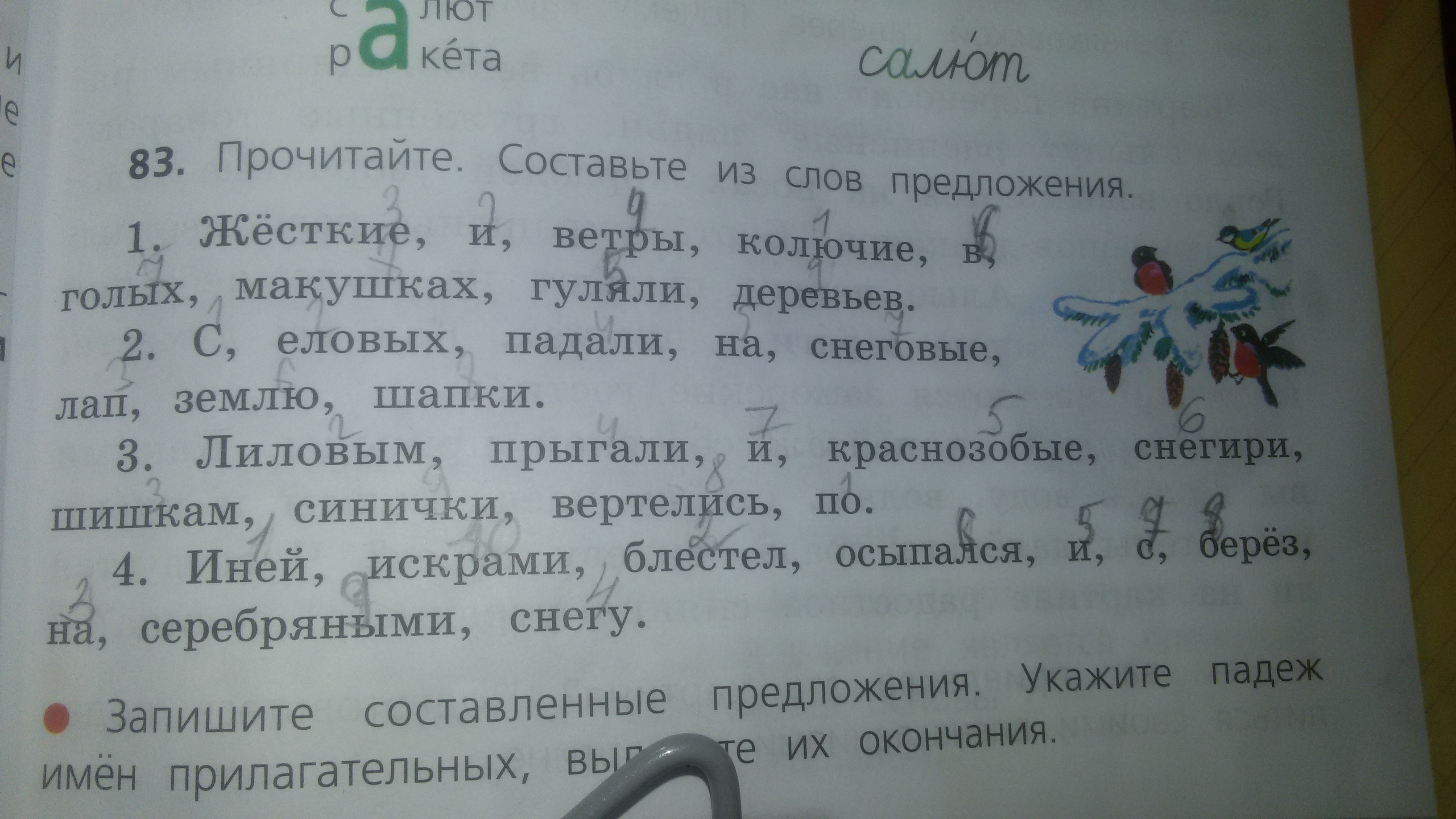 3.По лиловым шишкам прыгали снегири и вертелись краснозобые синички.