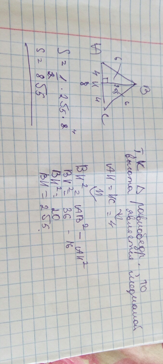 Найдите площадь равнобедренного треугольника, если известно, что его основание равно 8 см, а боковая сторона 6 см
