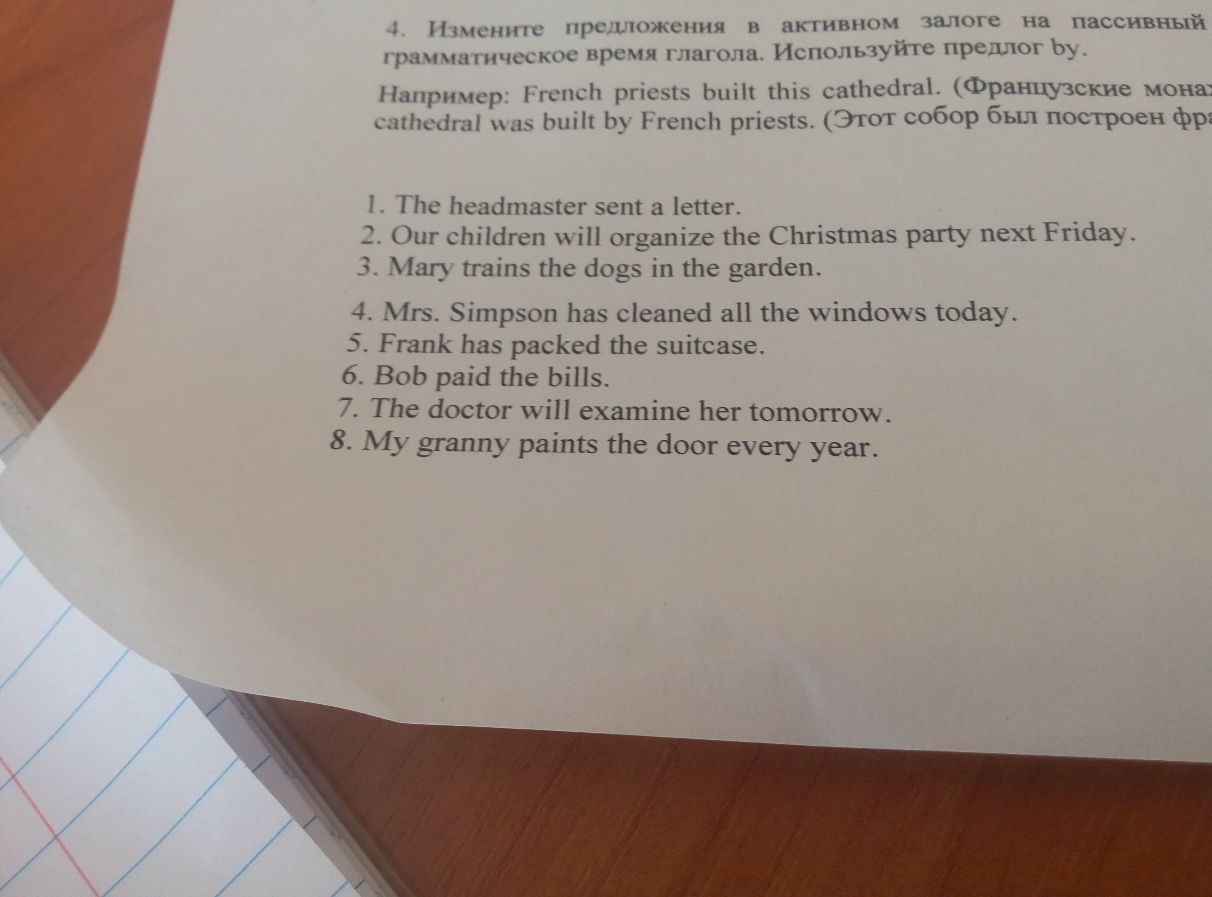 1A letter was sent by the headmaster. 3 The Christmas party will be organized by our children next Friday. 3The dogs are trained by Mary in the garden. 4All the windows have been cleaned by Mrs. Simpson today. 5The suitcase has been packed by Frank. 6The bills were paid by Bill. 7She will be examined by the doctor tomorrow. 8The door is painted by my granny every year.