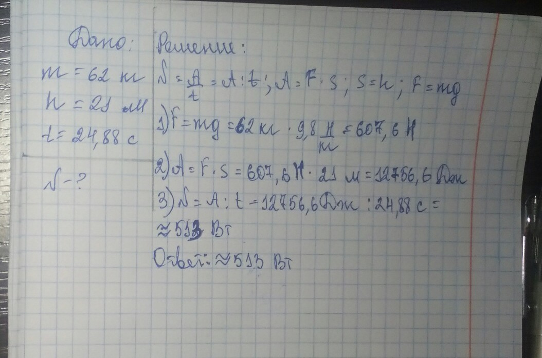 ребят у меня вес 62 кг высота по лестницам поднимался 21 метр и время за поднимания 24.88 cек какая у меня мощность оч надо